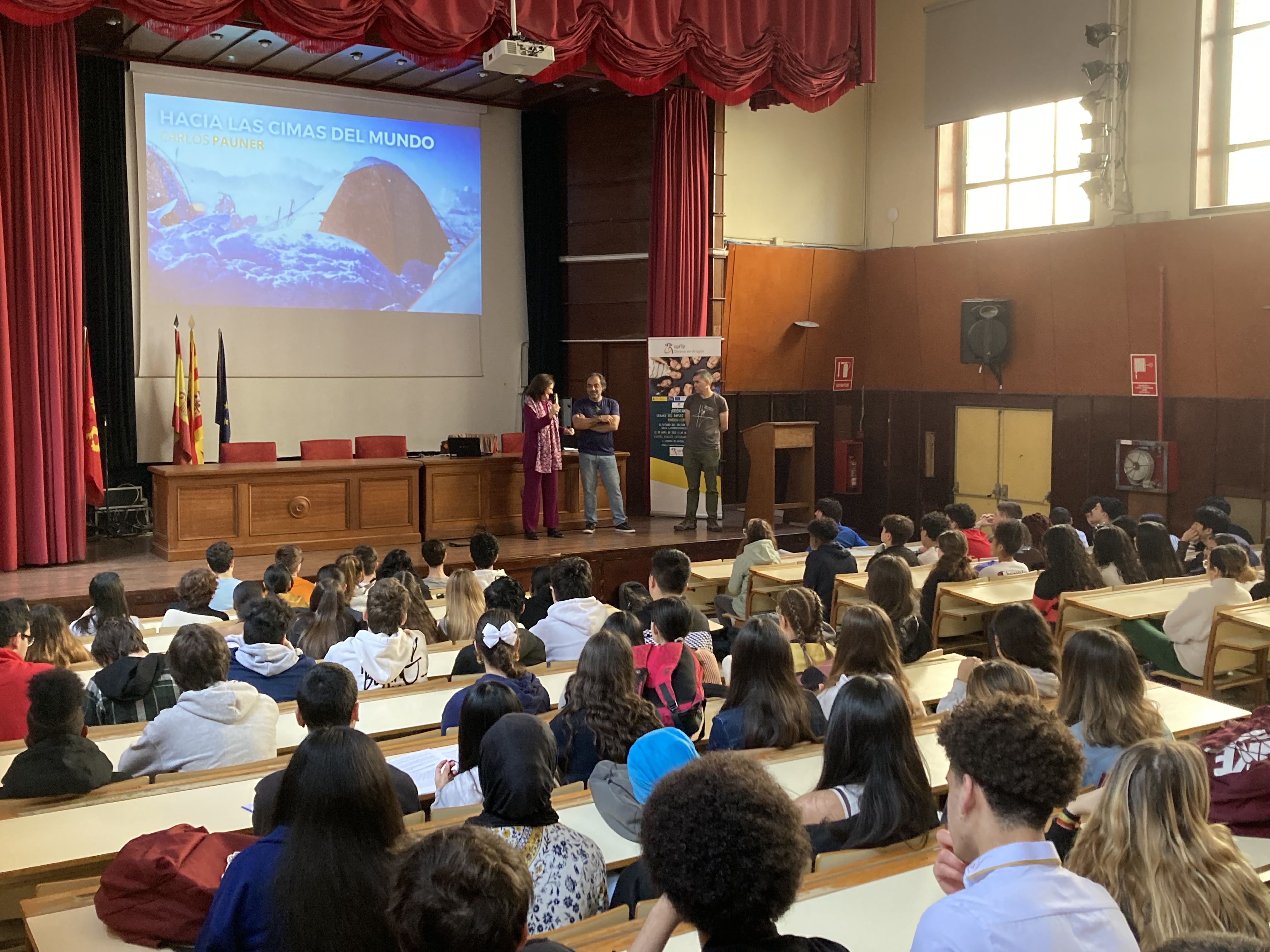 "Carlos Pauner, químico, piloto de aviación y montañero de referencia a nivel nacional e internacional (es el único aragonés que ha podido escalar los 14 ochomiles del mundo), nos ha visitado y dado una interesante charla sobre los valores que nos permiten conseguir con éxito nuestras metas. La curiosidad y la constancia nos deben acompañar en cada momento, en cada ascensión, en cada proyecto de vida. Dar las gracias a Zaragoza Deporte Municipal que, siendo representada por Juncal Aznárez, nos han permitido conocer y disfrutar de tan ilustre personaje"