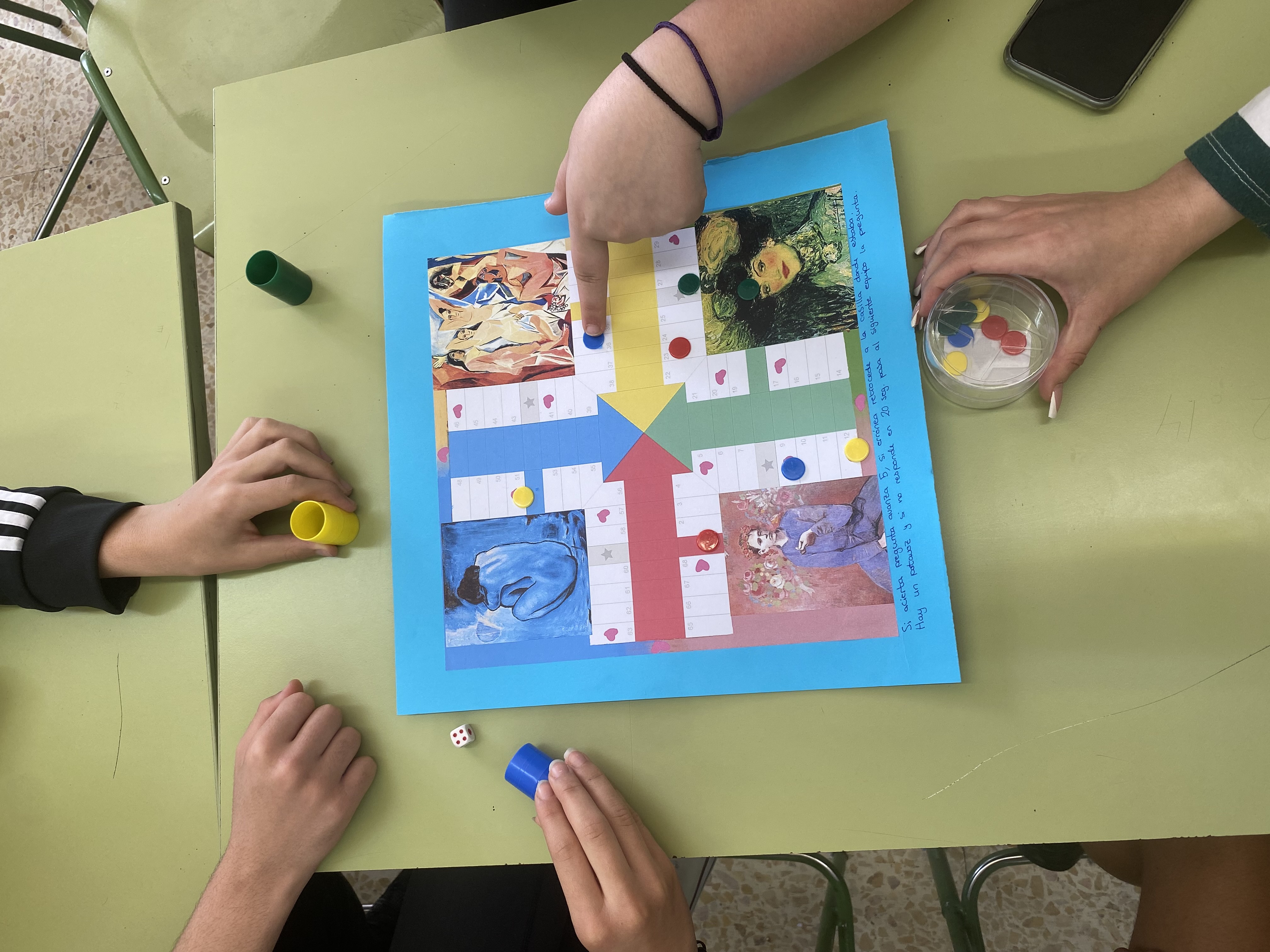 El juego consistía en un parchís con una serie de preguntas. Si las acertaban, iban avanzando.