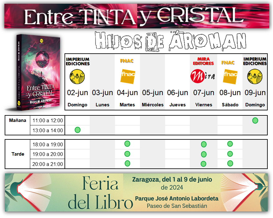 Si alguien quiere pasarse por la feria del libro para saludar a Román Abadías y, de paso, que le firme el libro, estará allí en el siguiente horario.