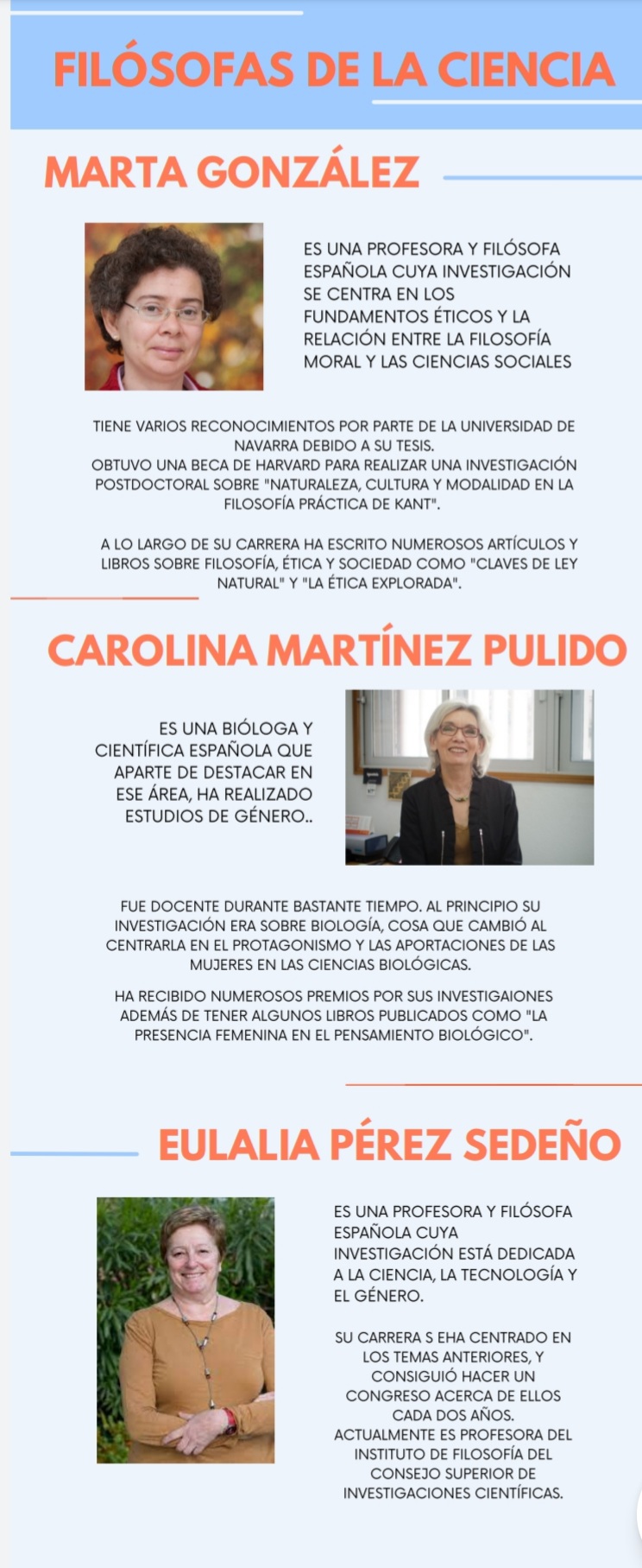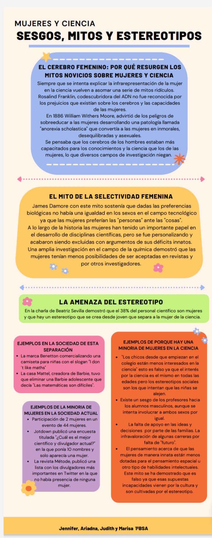 Al igual que la ciencia, la filosofía es un saber racional y crítico aunque investigue desde un punto de vista diferente. Uno de sus puntos de investigación es la Filosofía de la ciencia, que abarca varios campos de estudio. Uno de ellos es la sociología de la ciencia, es decir, la ciencia como actividad humana, no está exenta de prejuicios y estereotipos a la hora de llevar a cabo las investigaciones. Desde este marco de referencia los alumnos y alumnas de 1º de Bachillerato han elaborado infografías donde han analizado: