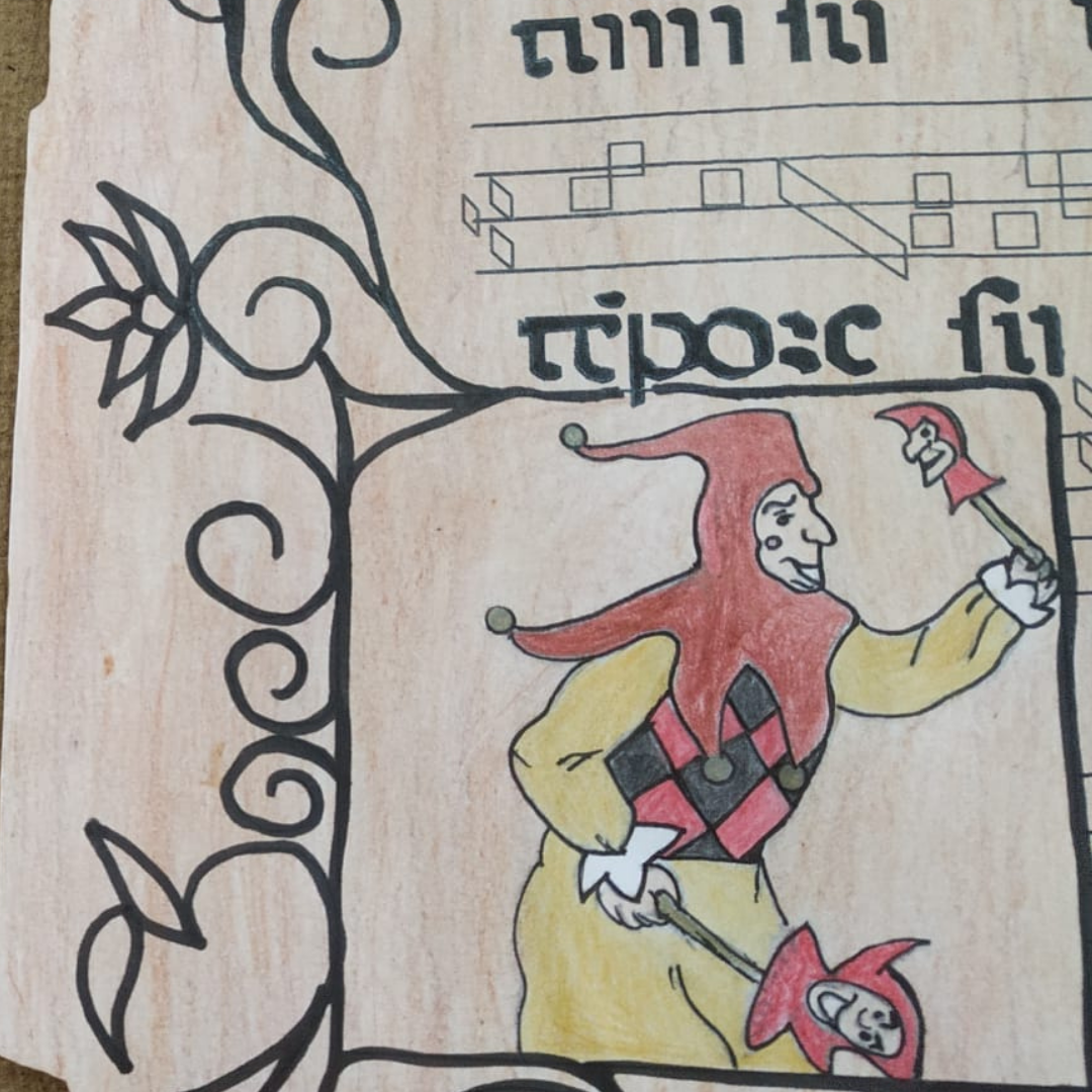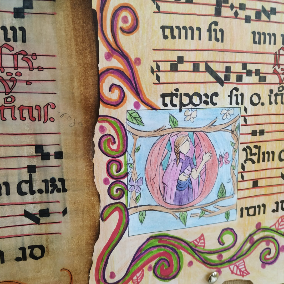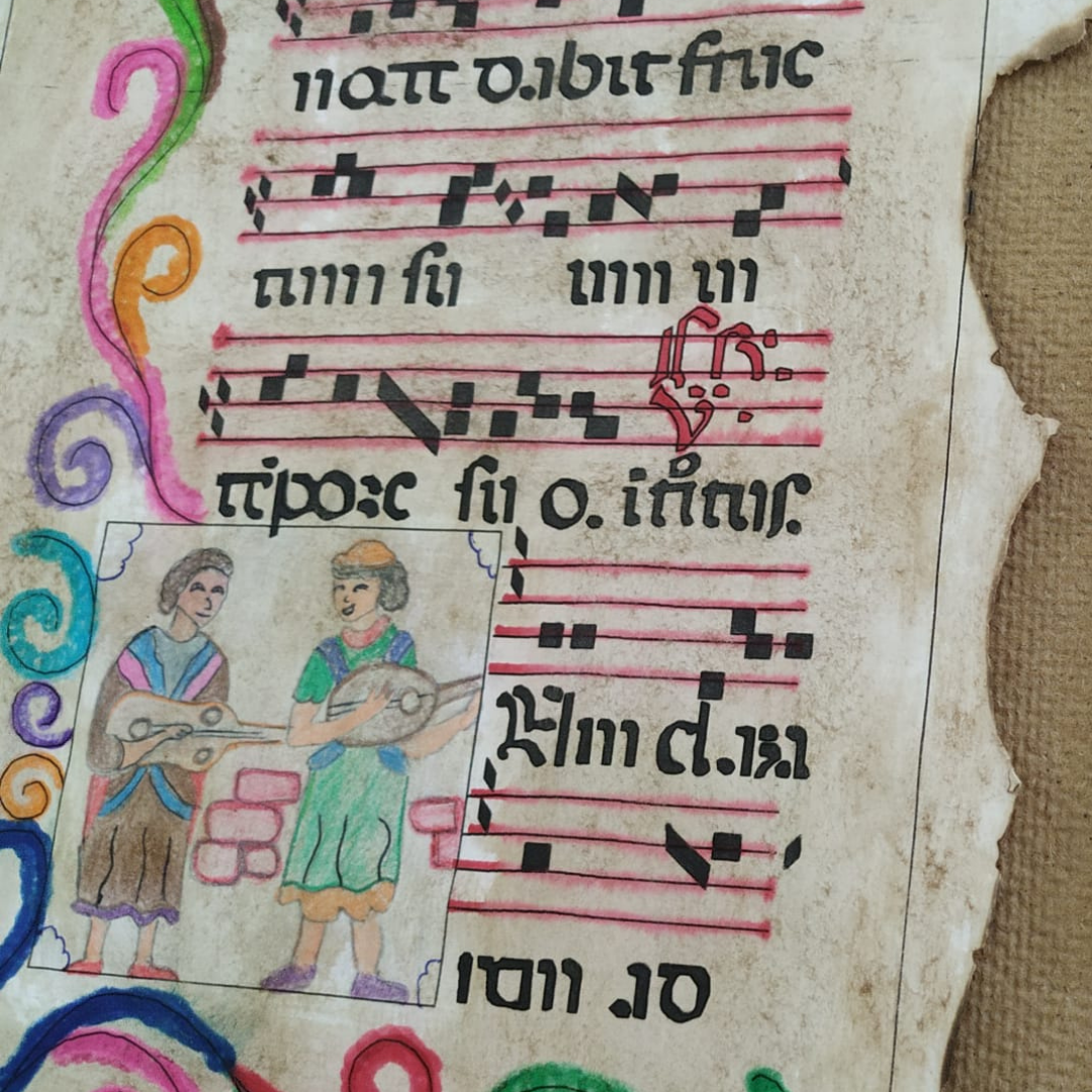 Para finalizar el estudio de la música en la Edad Media, los alumnos y las alumnas imitando el pergamino de piel de cordero que se utilizaba en los scriptorium han iluminado el texto y han realizado miniaturas como los copistas en los monasterios.