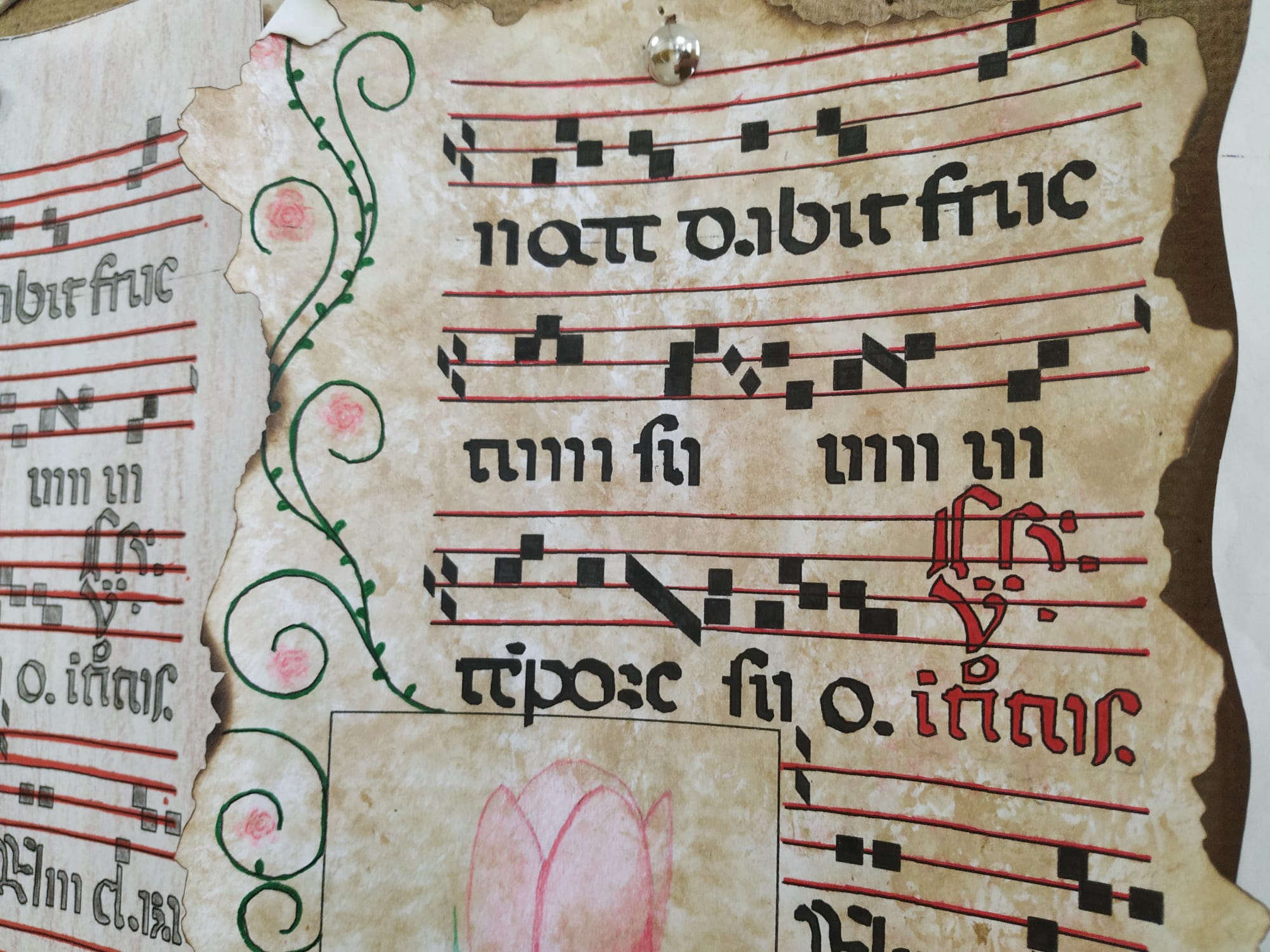 Los grupos de 3º de ESO no bilingüe, con mucha paciencia, han iluminado una partitura medieval como hacían los monjes en la Edad Media.