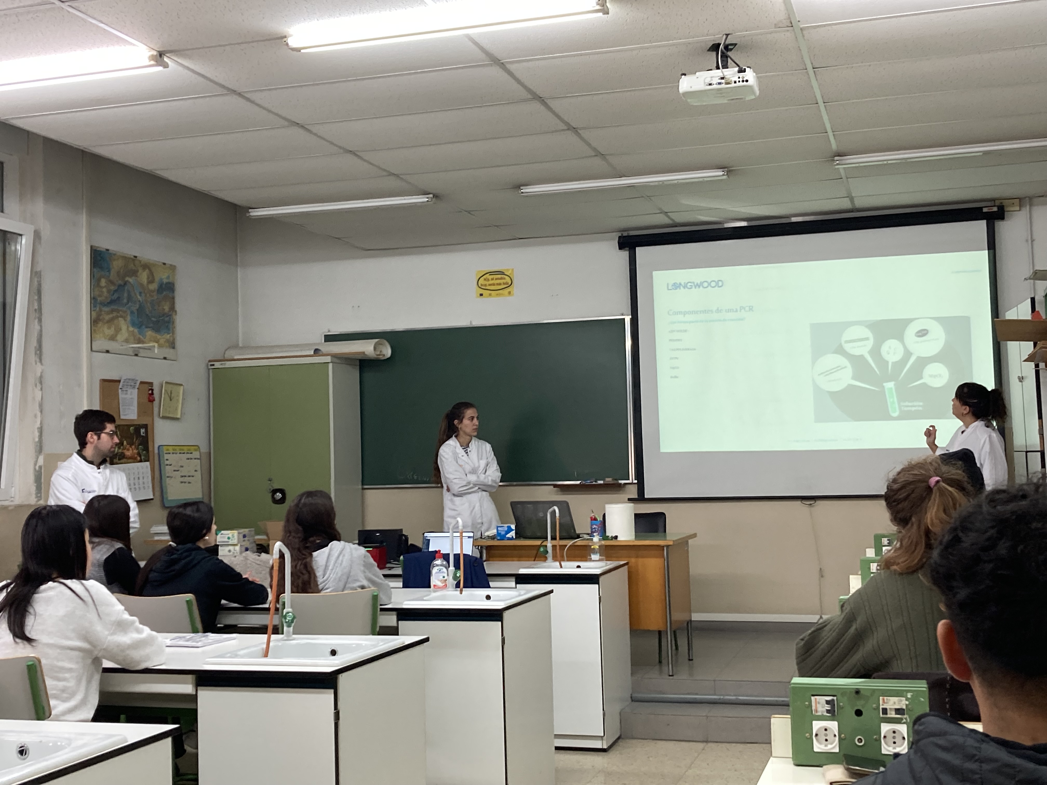 Los alumnos de primero de bachillerato han asistido a un interesante taller impartido por la empresa Diagnóstica Longwood. Han explicado cómo a través de una PCR se puede diagnosticar si una persona tiene el gen asociado a una enfermedad genética (en este caso la espondilitis anquilosante). Los alumnos han elaborado las muestras que han introducido en el termociclador y han sabido interpretar los resultados.
