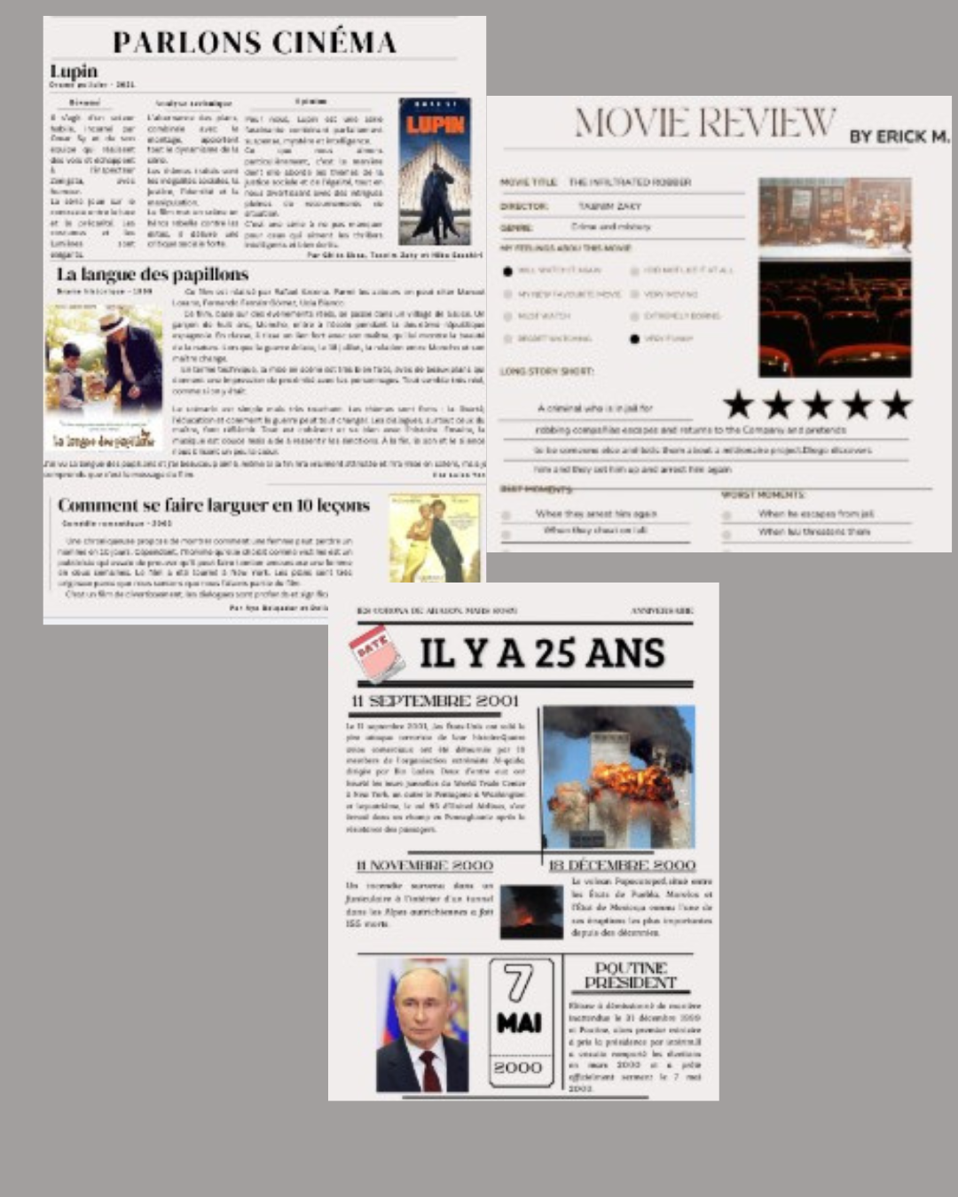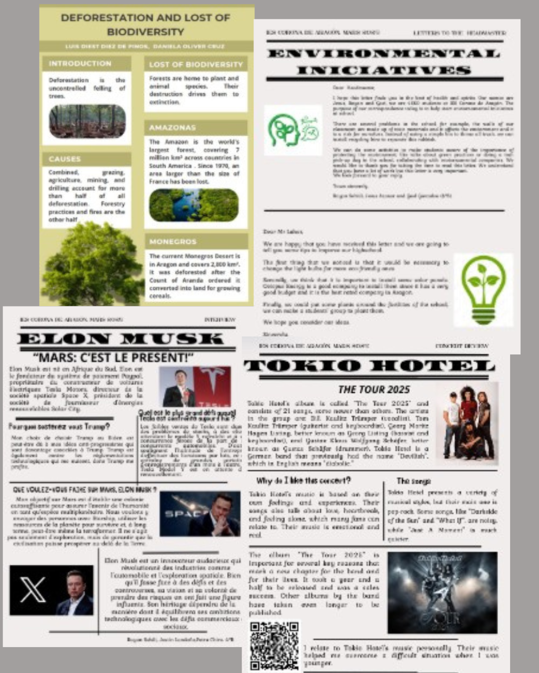 En el periódico de1º y 2º ESO, podéis leer sobre ciudades y deportistas franceses, también noticias sobre nuevas tecnologías, por ejemplo, sobre la IA. Hay una sección de sucesos, reseñas de viajes de ciudades del Reino Unido, artículos cientificos e información sobre músicas del mundo. También podéis leer sobre cómo las matemáticas están al servicio del consumidor, ¡que no os engañen cuando vais a comprar!. Además, "la Tía Agonía" responde a las cartas de los lectores y les da consejos acerca de sus quebraderos de cabeza, hay anuncios de casas por si estás pensando en mudarte, y como no, una sección de juegos como "quién es quién" o acertijos matemáticos.
