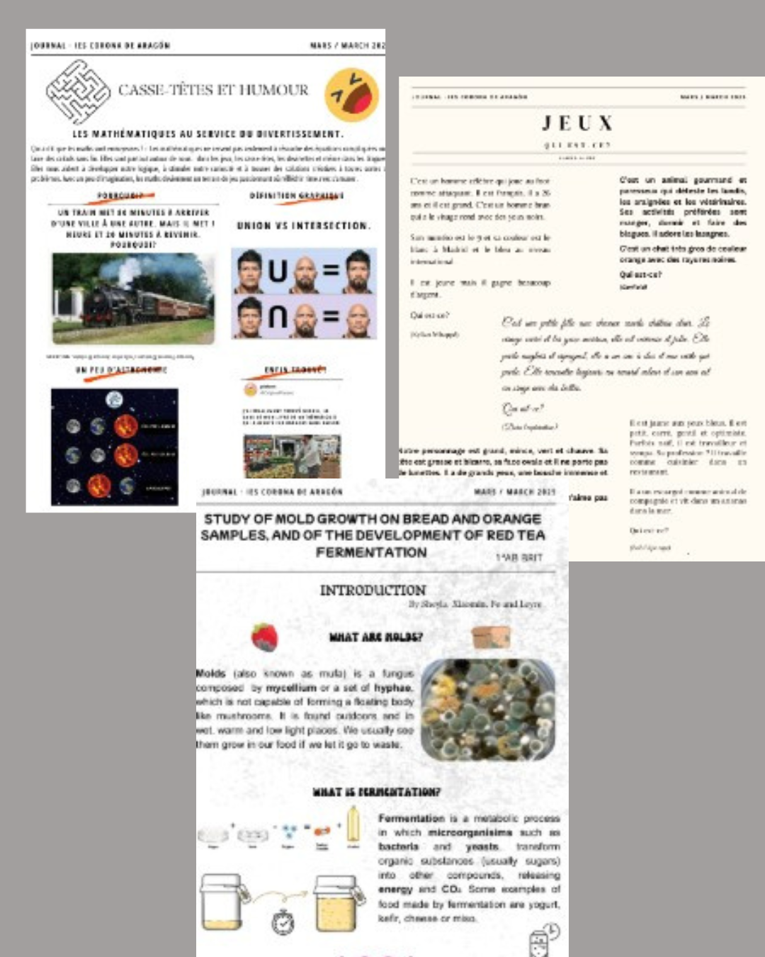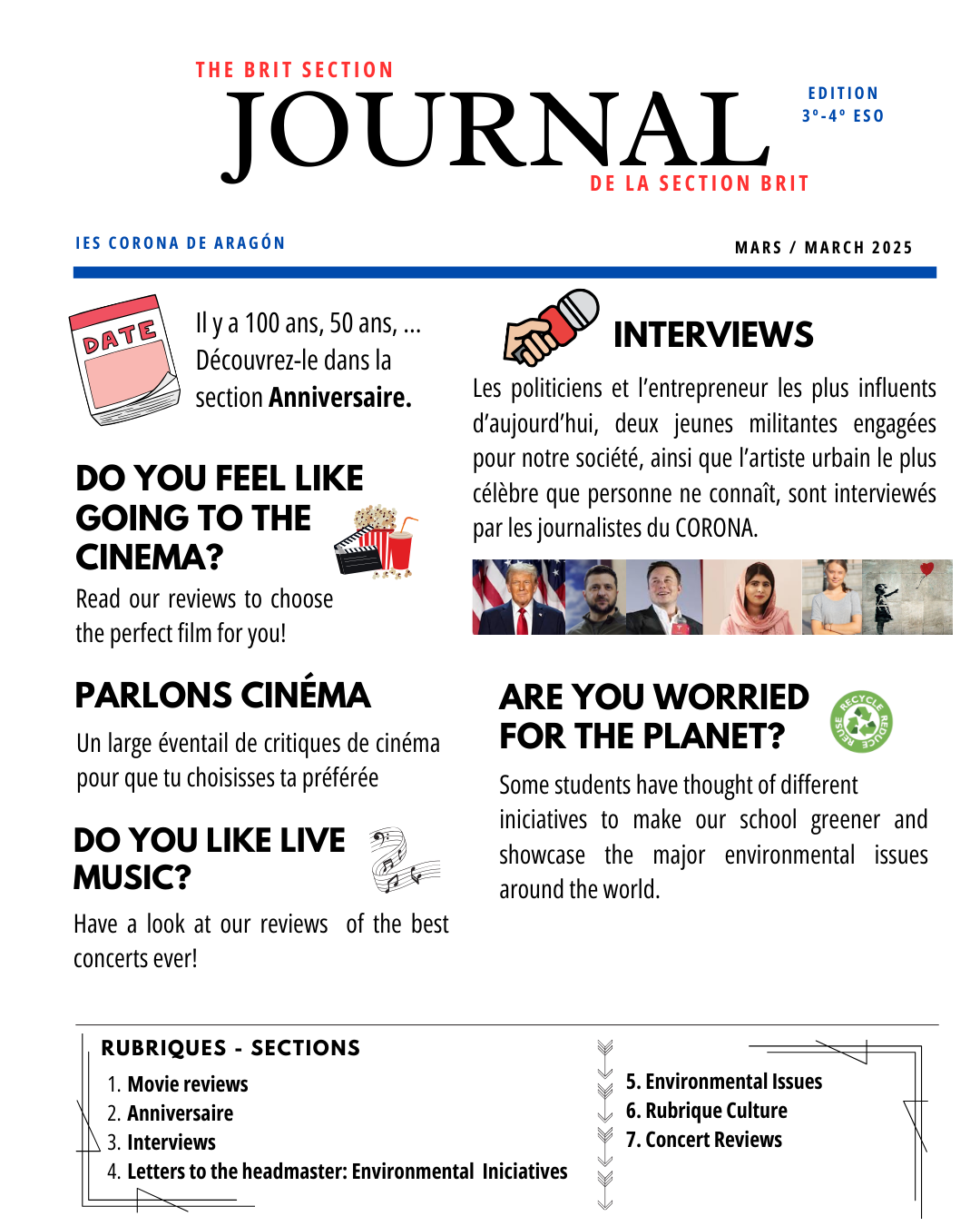 Durante el segundo trimestre, el alumnado BRIT se ha convertido en periodistas y han elaborado unos periódicos de la sección plurilingüe, uno en 1º y 2º BRIT, y otro en 3º y 4º BRIT. Tienen secciones de todo tipo.