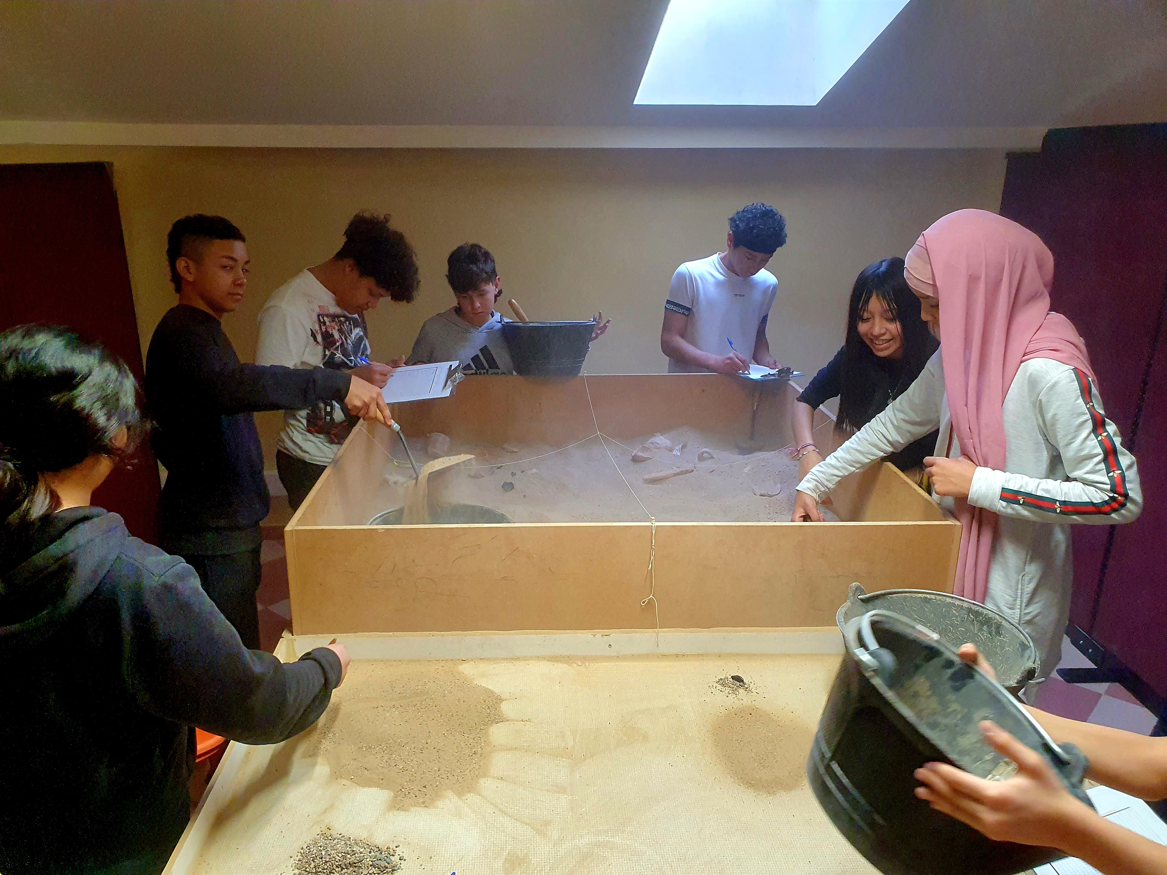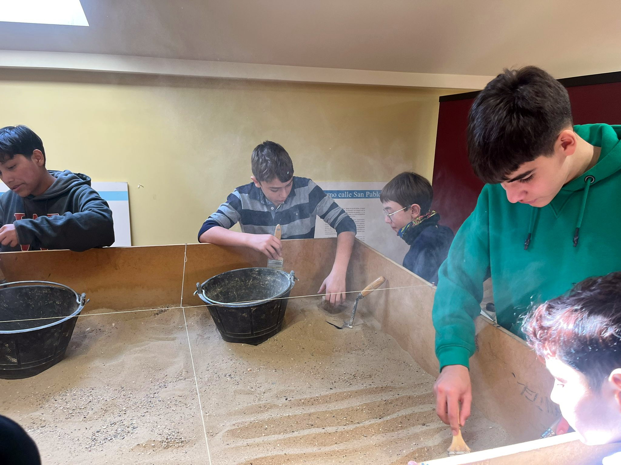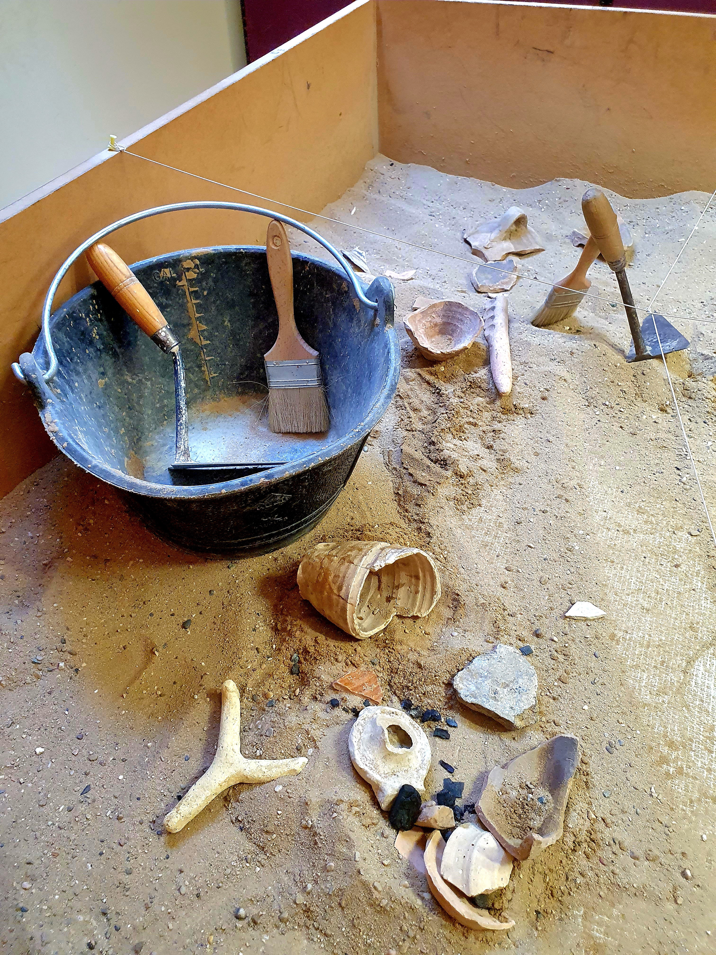 Luego vieron lo que es una excavación arqueológica (técnicas y hallazgos). La cerámica es importante ya que aparece en todos los yacimientos y nos indica que cultura la ha fabricado y por lo tanto la cultura de la excavación y a que se dedicaba el espacio, hay cerámica de mesa en el comedor, cerámica de cocina en la cocina, tinajas en las bodegas. Igual de importante son las monedas. También aparecen metales, huesos de animales que permiten ver qué se comía o carbón que nos habla de cocina. En épocas más recientes encontramos balas, botellas y plásticos.