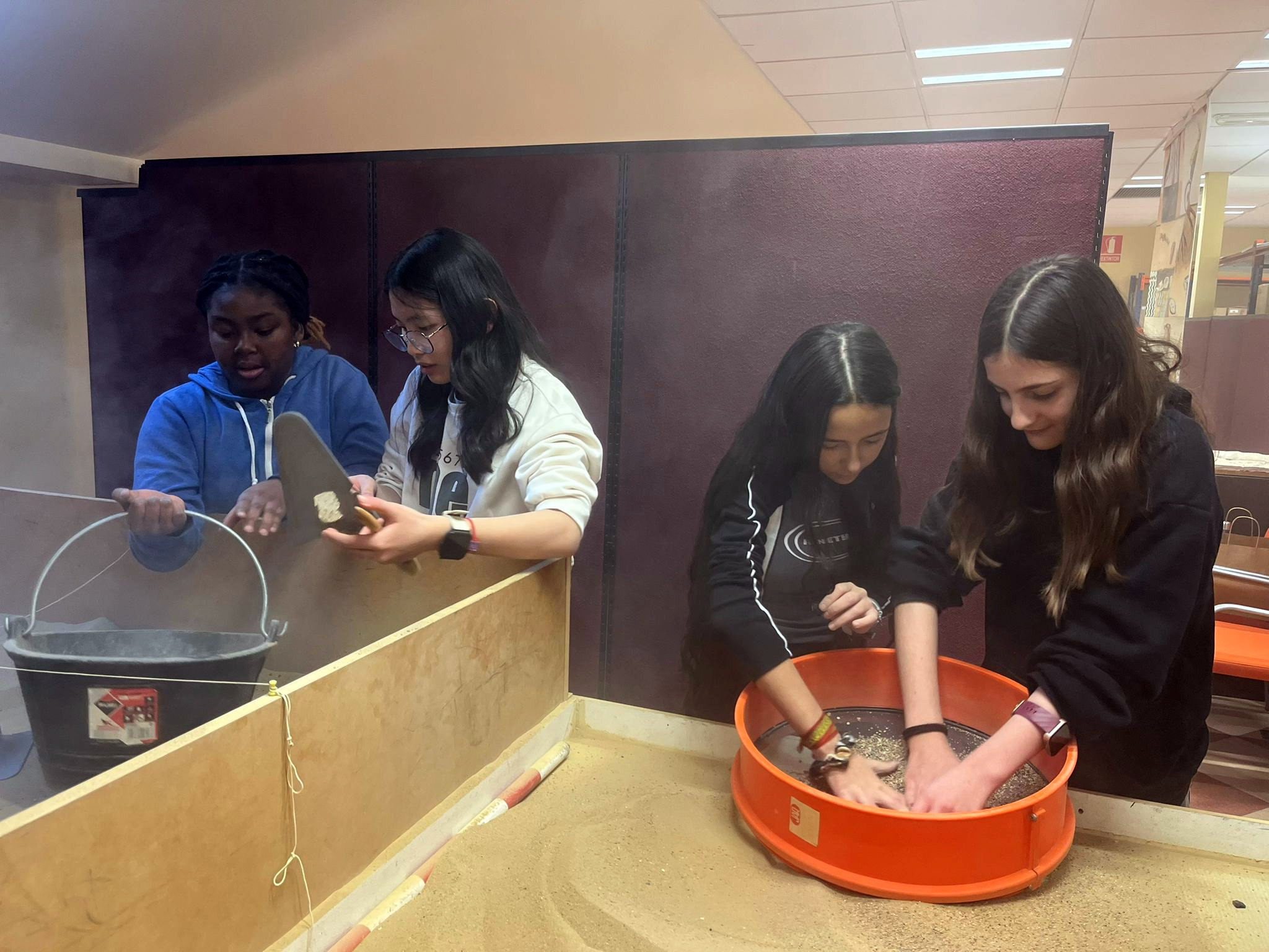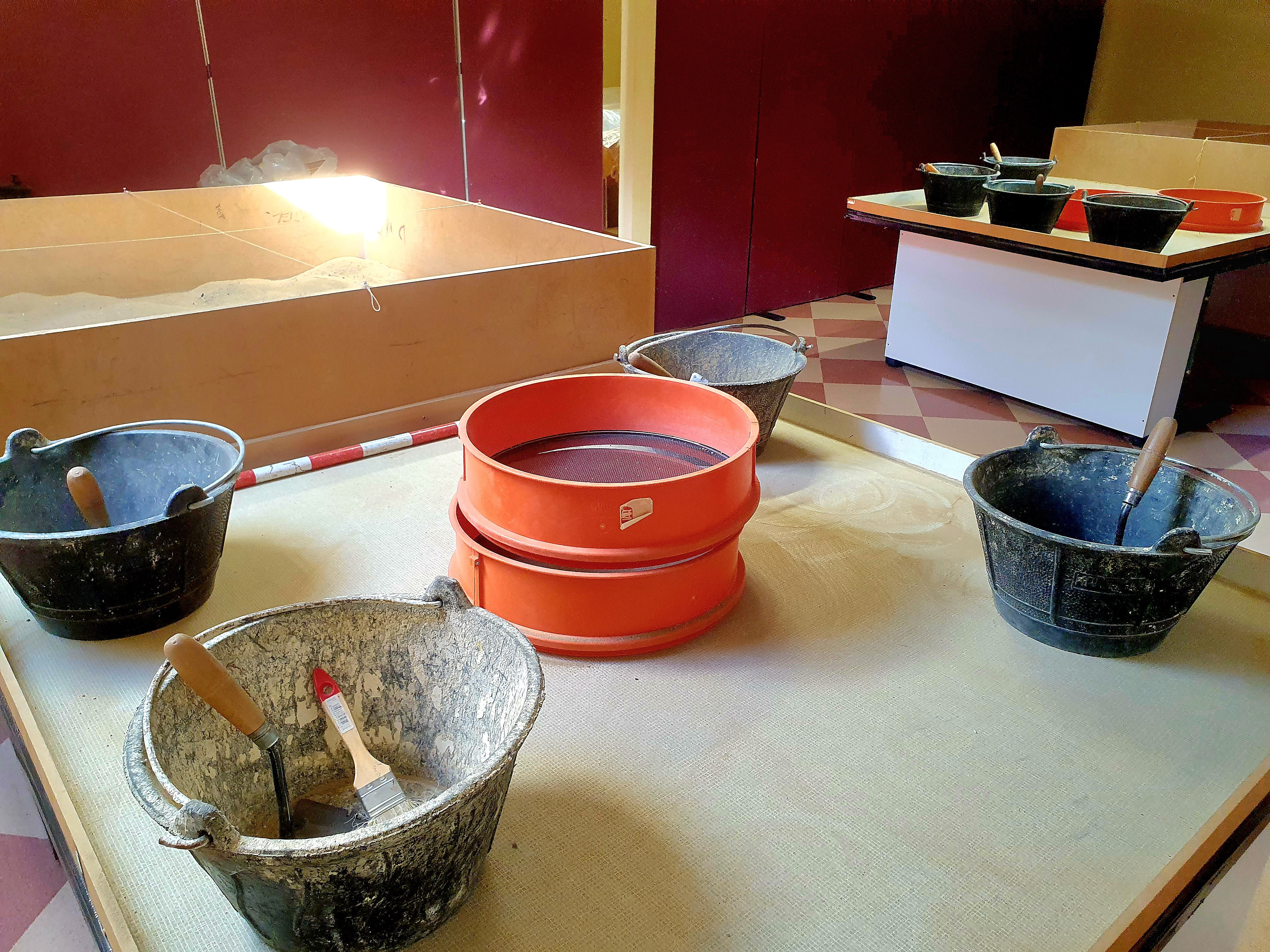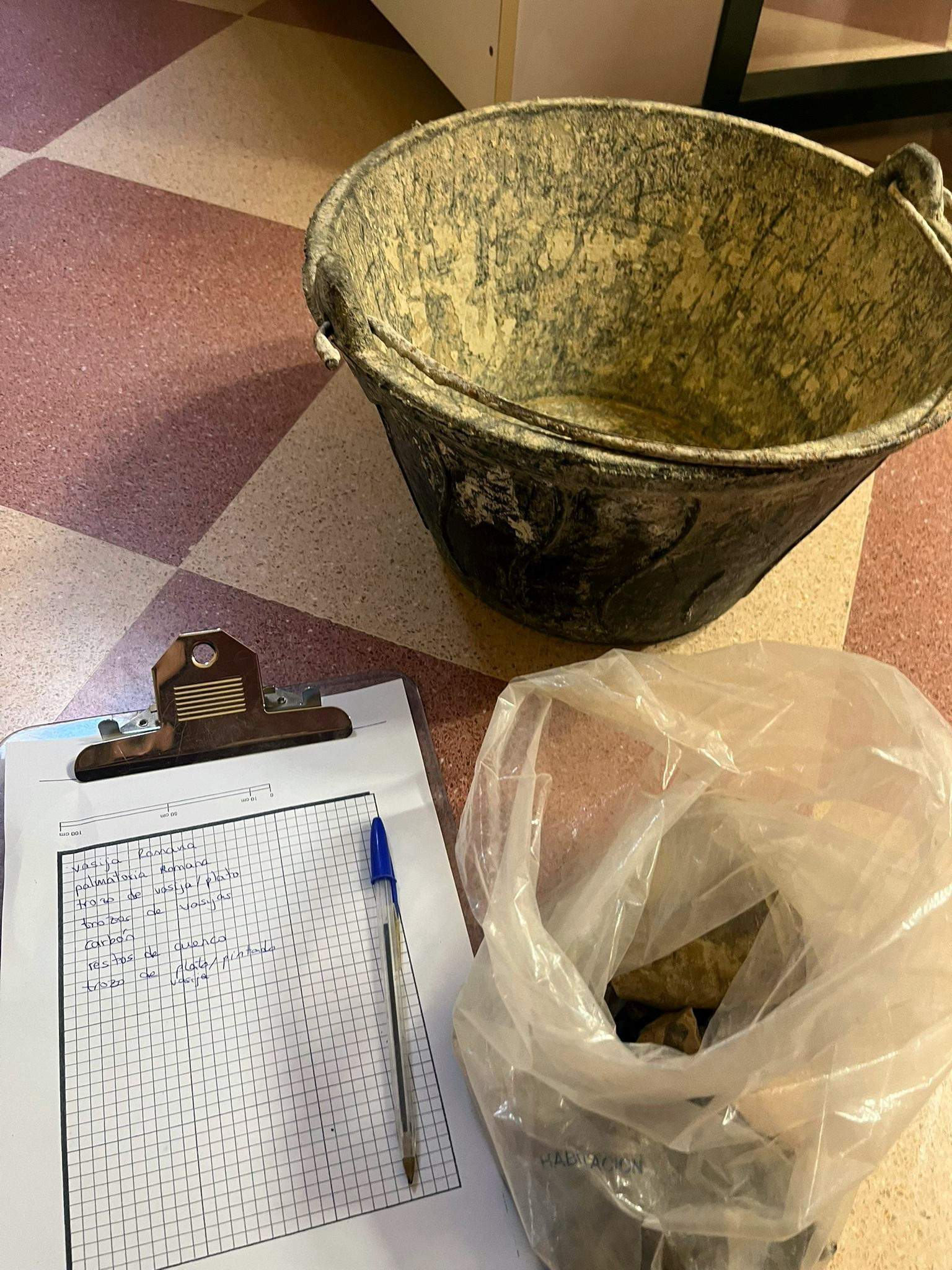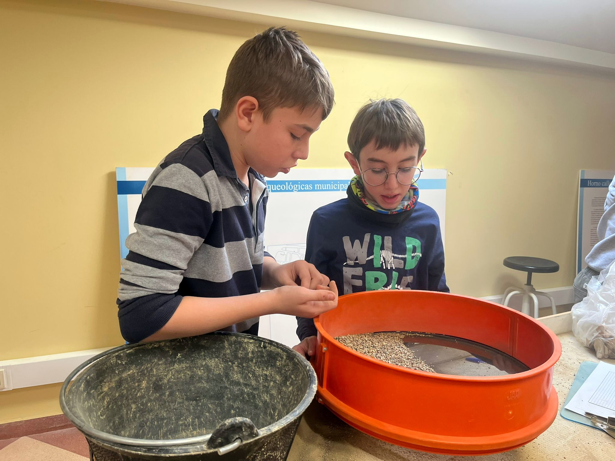 Luego vieron lo que es una excavación arqueológica (técnicas y hallazgos). La cerámica es importante ya que aparece en todos los yacimientos y nos indica que cultura la ha fabricado y por lo tanto la cultura de la excavación y a que se dedicaba el espacio, hay cerámica de mesa en el comedor, cerámica de cocina en la cocina, tinajas en las bodegas. Igual de importante son las monedas. También aparecen metales, huesos de animales que permiten ver qué se comía o carbón que nos habla de cocina. En épocas más recientes encontramos balas, botellas y plásticos.