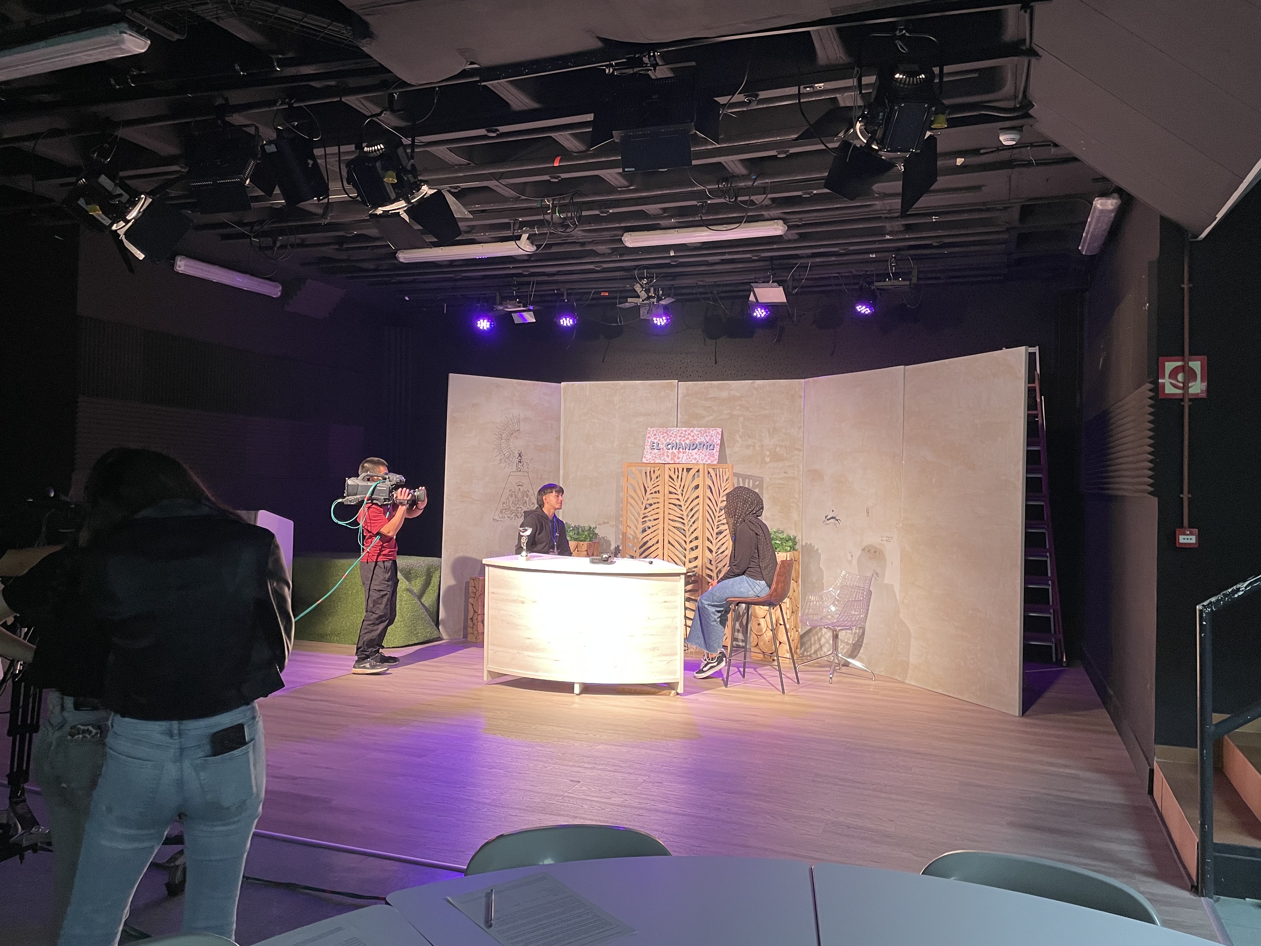 A continuación nos trasladamos a uno de los platós. Allí, divididos en equipos, los estudiantes idearon un breve guion y asumieron los distintos roles de un rodaje profesional: interpretación, regiduría, sonido, iluminación, realización y cámaras. Tras las indicaciones del equipo docente del CPA, se encendió la claqueta y comenzó la grabación.