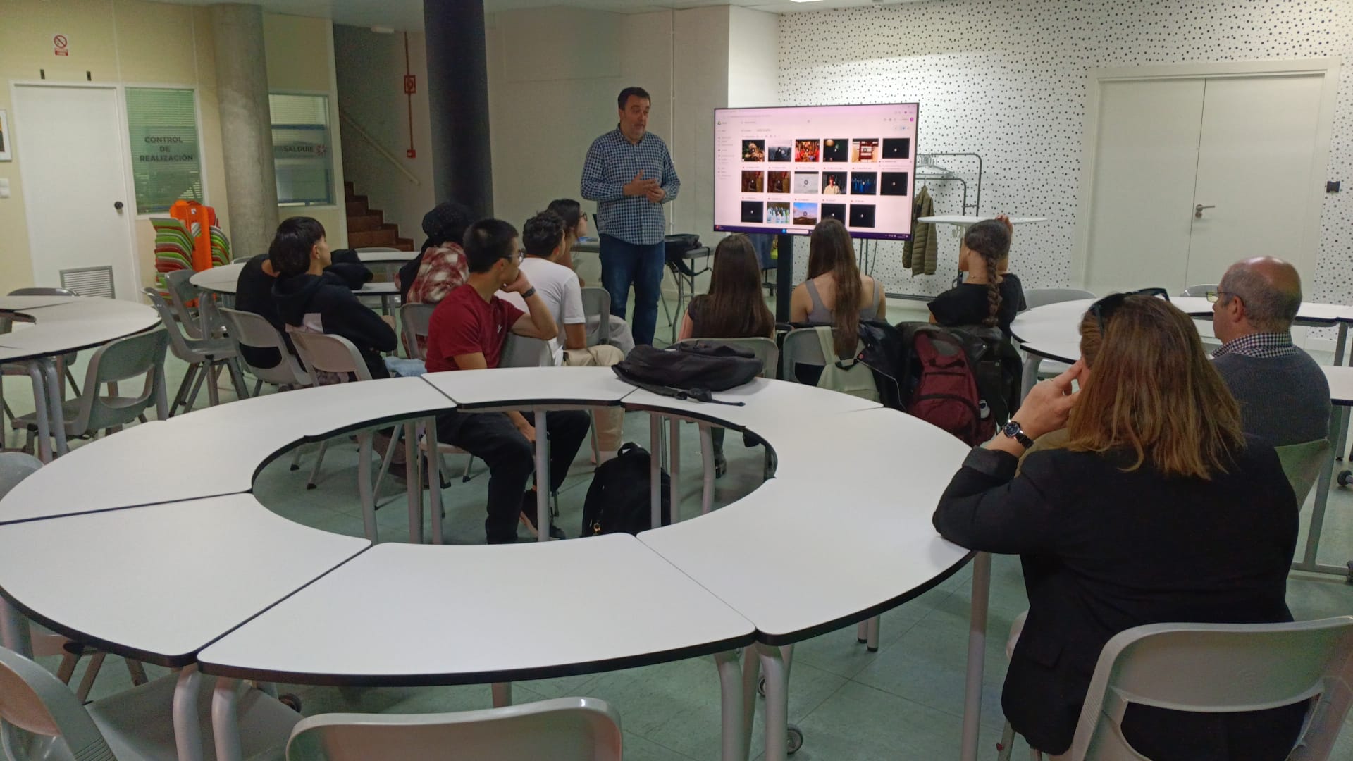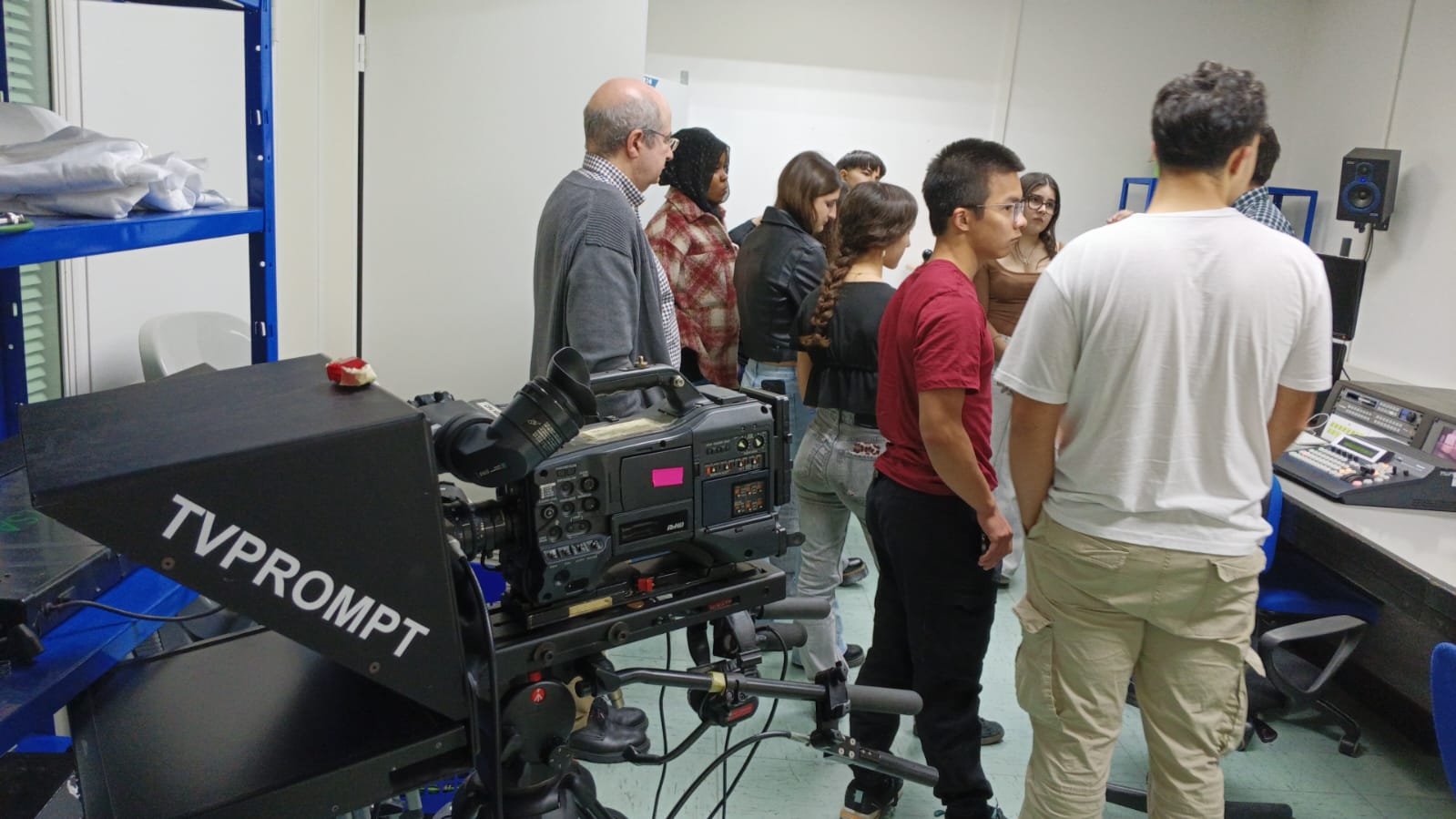 Mientras un técnico profesional montaba el material grabado, el grupo visitó el resto de las instalaciones: otros platós, la videoteca y varias aulas. Esta visita guiada permitió a los alumnos conocer la infraestructura y tecnología que se emplea a diario en la creación de contenidos audiovisuales.