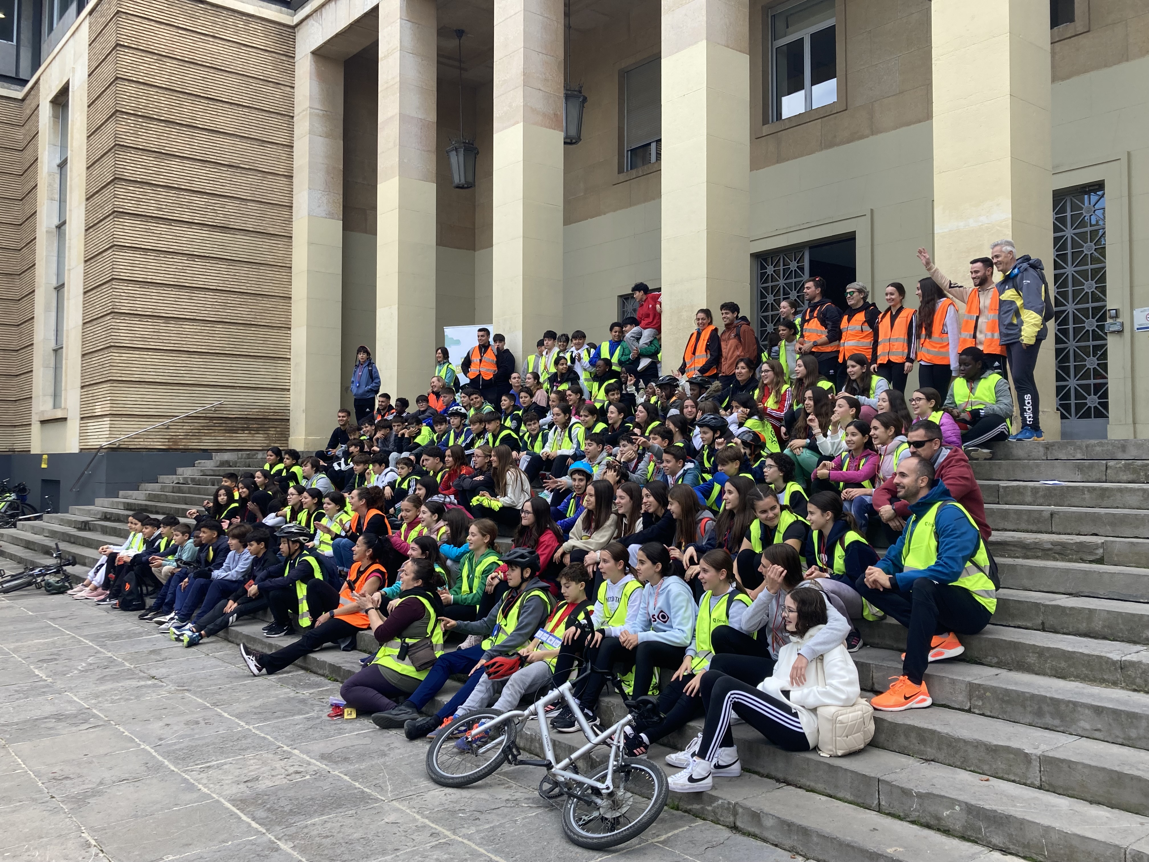 Allí nos juntamos con los grupos embajadores de los otros institutos (Azucarera, El Portillo, Miguel Servet, etc). Practicamos maniobras, juegos y postas de mecánica de bici.