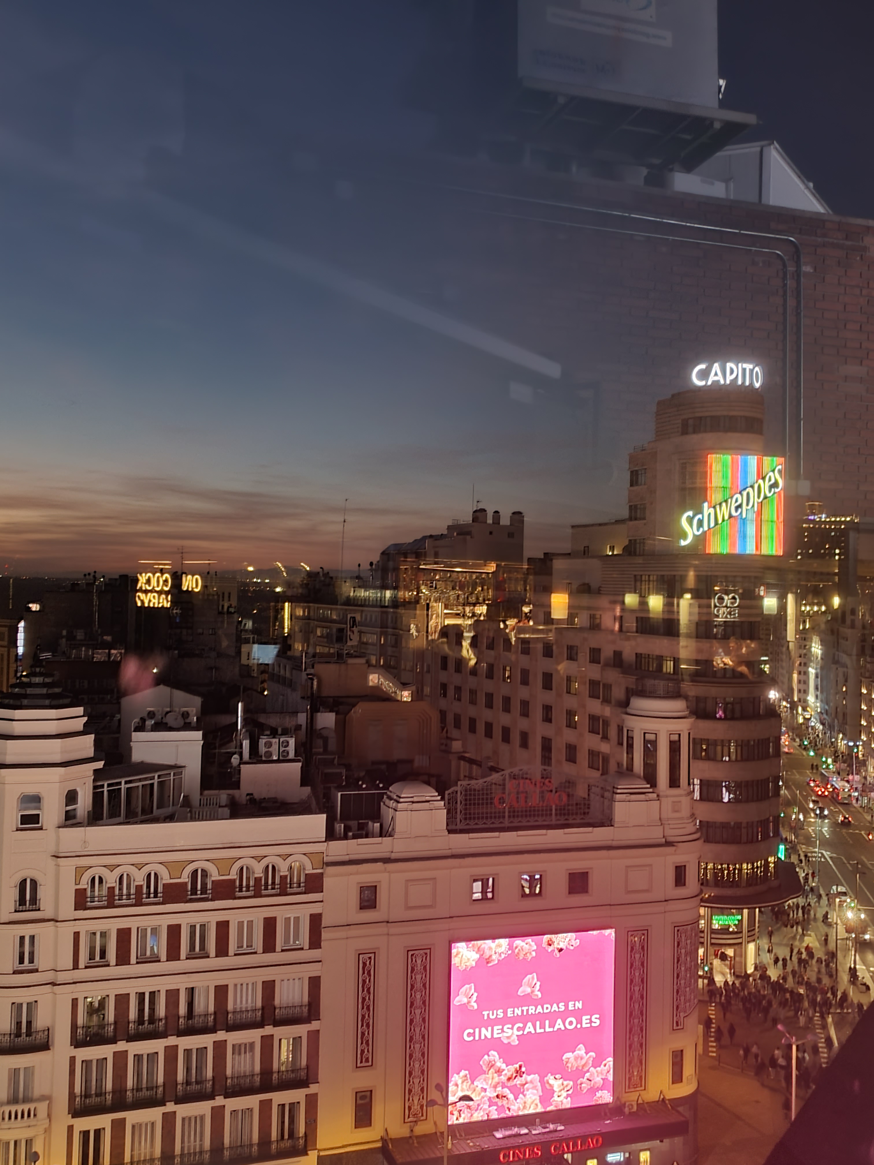 La tarde fue para pasear por Madrid: Puerta del Alcalá, plaza de Cibeles, Gran Via con edificio-gran almacen años20-50 de Primark y Uniqlo, plaza de Oriente, Palacio Real, Plaza Mayor, Puerta del Sol, Callao y letrero ilutimando del Capitol, Palacio de Congresos y la cúpula del Hotel Palace.